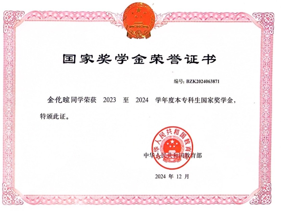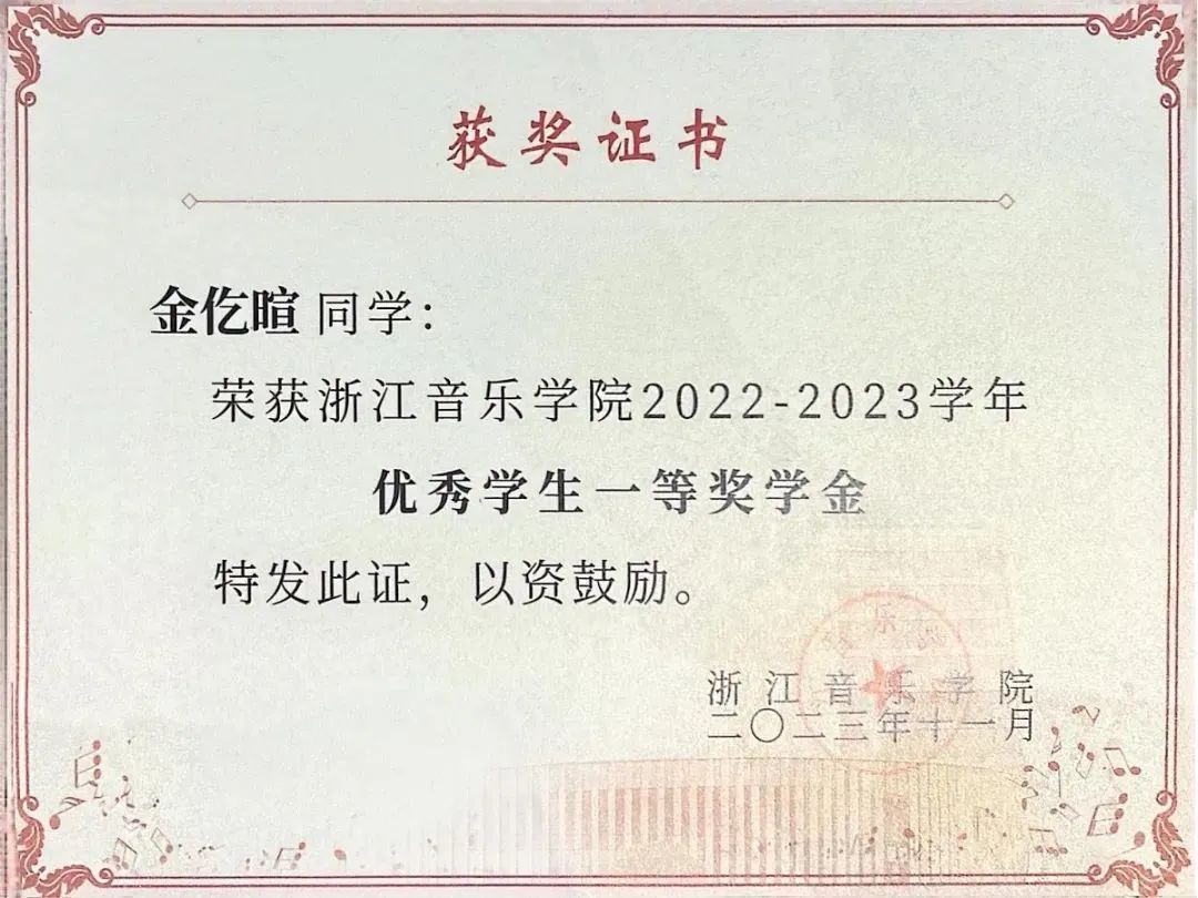 金仡暄的大学生活忙碌而充实。国家奖学金、省政府奖学金、专业优秀一等奖学金……一项项荣誉,伴随她从懵懂新生完成蜕变,叩开了属于自己的艺术之门。