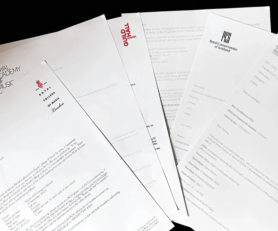 大四寒假,赵泰宁决定踏上国际求学的征程,开始筹备海外研究生申请。终于,他收到了6封来自英伦顶尖音乐学府的橄榄枝,每一份录取通知书都在诉说着一个关于坚持与热爱的故事。