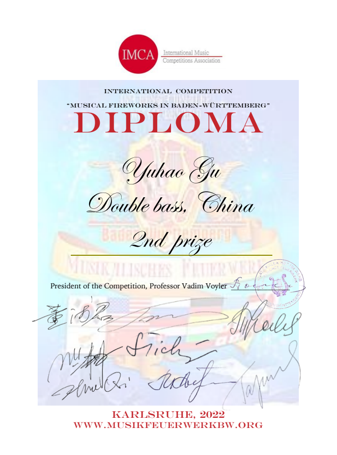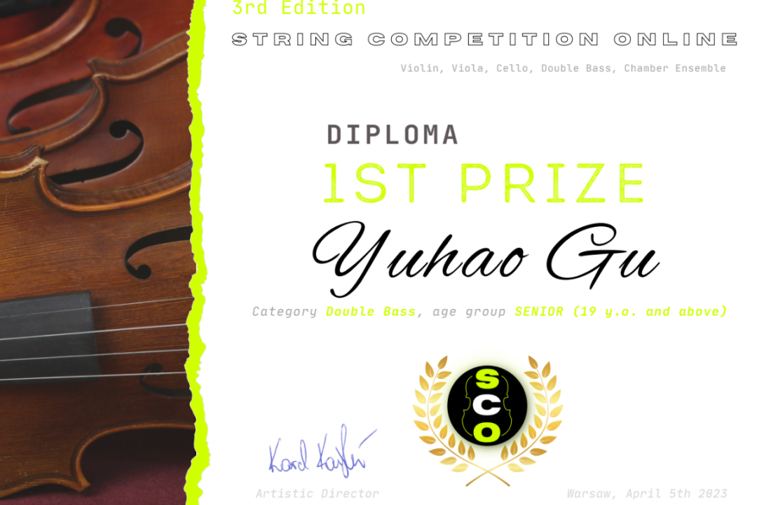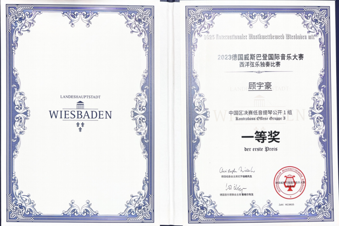舞台与赛场,是顾宇豪艺术成长最好的见证者与试金石。2022年,他站在《华夏随想》王和声管乐作品专场音乐会的舞台上;2025年寒冬,他以大提琴独奏家的身份,参加宁波天一书局的“冬暄雅集”活动。2022年IMCA国际音乐比赛二等奖、2022年德国音乐学院低音提琴国际音乐大赛取前16强、2023年波兰弦乐国际音乐大赛获得一等奖......