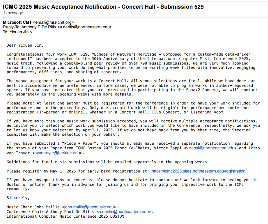 在导师的引导下,她尝试将作品投稿至国际学术会议和音乐节。通过3个月的时间反复调试、建立动作与声效的映射模型,她最终完成作品《听见自然的身世-为自制数据驱动乐器“齿链”而作》,并即将登上今年的国际计算机音乐大会(ICMC)、国际新型音乐界面大会(NIME)等世界顶级学术会议。
